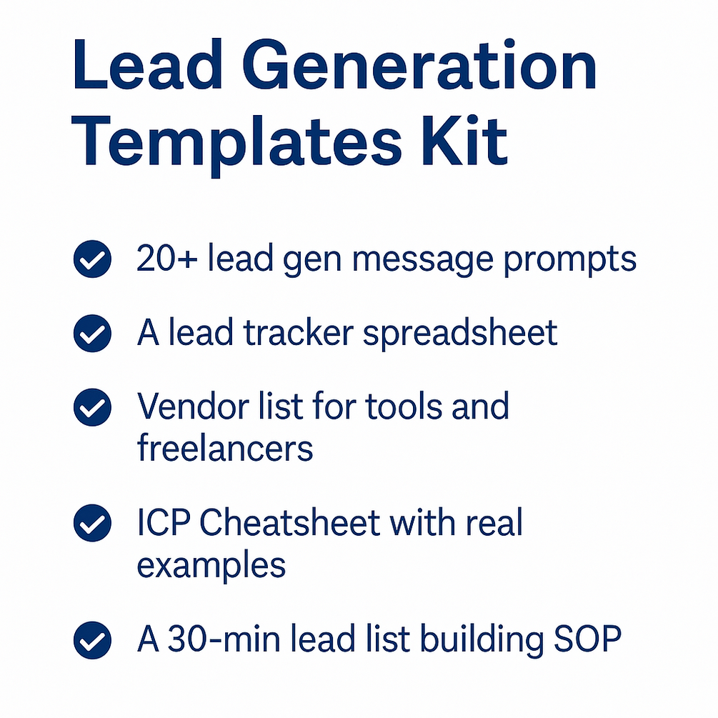 ✅ 20+ cold message prompts for email, LinkedIn, Slack ✅ Ideal Customer Profile cheatsheet ✅ Lead list tracker spreadsheet (Excel) ✅ Sourcing tool & vendor guide ✅ 30-minute lead building SOP ✅ Great for first-time outbound or refining ICP